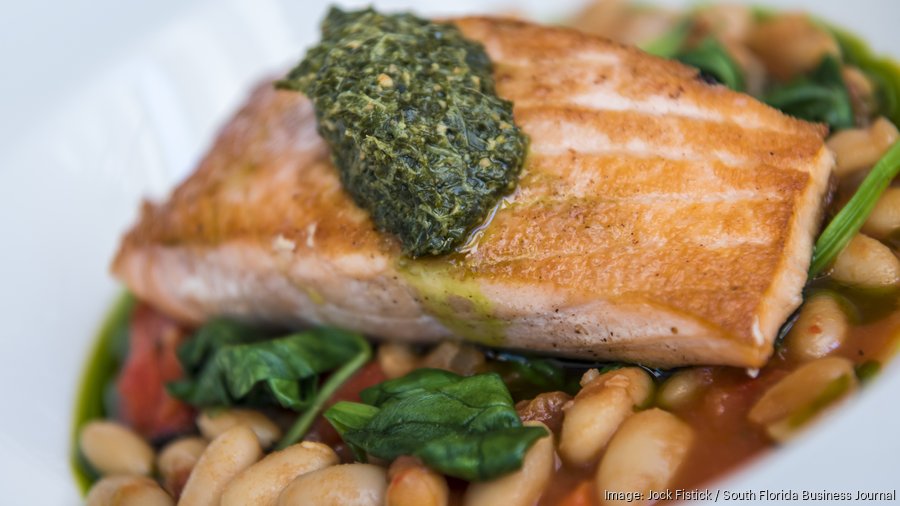 One of Farmer’s Table sustainable seafood dishes – Pan Roasted “FTA” Salmon, gluten free, featuring Tuscan Bean & Vegetable Ragout, Organic Spinach, Kale Pesto $26