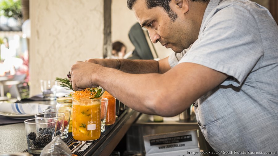 Sheikh Saleh, Mixologist, Farmer’s Table, prepares an apothecary style healthy elixir, packed with fresh herbs and produce known for their healing properties.